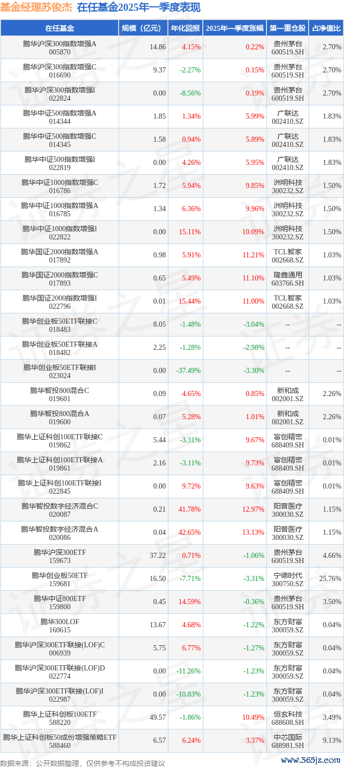 鹏华沪深300ETF现任基金经理为苏俊杰。其中在任基金经理苏俊杰已从业5年又225天,2023年6月21日正式接手管理鹏华沪深300ETF,任职期间累计回报为1.3%。目前还管理着31只基金产品(包括A类和C类),其中本季度表现最佳的基金为鹏华智投数字经济混合A(020086),季度净值涨幅为13.13%。