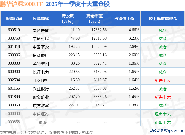 从基金规模来看,鹏华沪深300ETF基金2025年一季度公布的基金规模为37.22亿元,较上一期规模43.48亿元变化了-6.26亿元,环比变化了-14.4%。该基金最新一期资产配置为:股票占净值比99.02%,无债券类资产,现金占净值比0.95%。从基金持仓来看,该基金当季前十大股票仓位达22.68%,第一大重仓股为贵州茅台(600519),持仓占比为4.66%。