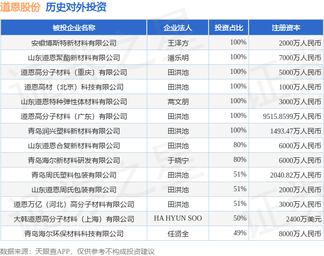 本站消息,根据天眼查APP显示,道恩股份(002838)新增一起对外投资事件,被投资公司为安徽博斯特新材料有限公司,法定代表人王泽方,投资占比为100%。该公司从事橡胶和塑料制品业一片红配资一片红配资,注册资本为2000万人民币。目前,道恩股份共存在对外投资14项,详见下表: