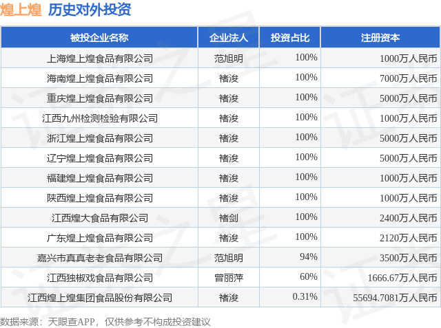 本站消息,根据天眼查APP显示,煌上煌(002695)新增一起对外投资事件,被投资公司为江西煌上煌集团食品股份有限公司派生资本,法定代表人褚浚,投资占比为0.31%。该公司从事食品制造业,注册资本为55694.7081万人民币。目前,煌上煌共存在对外投资13项派生资本,详见下表: