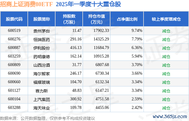 从基金规模来看,招商上证消费80ETF基金2025年一季度公布的基金规模为18.38亿元,较上一期规模20.08亿元变化了-1.7亿元,环比变化了-8.47%。该基金最新一期资产配置为:股票占净值比99.75%,债券占净值比0.02%,现金占净值比0.28%。从基金持仓来看,该基金当季前十大股票仓位达48.88%泸深投,第一大重仓股为贵州茅台(600519),持仓占比为9.74%。