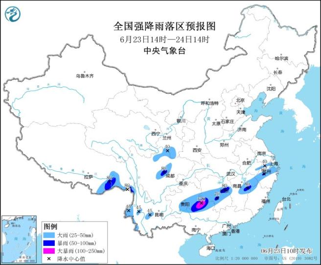 预计,6月23日14时至24日14时,甘肃南部、川西高原北部、四川盆地西部、贵州东南部、湖南中部和西南部、江西中北部、浙江中北部、福建西北部、广西北部、云南西部、西藏东南部等地部分地区有大到暴雨,其中,贵州东南部、湖南西南部、广西北部等地局地有大暴雨(100~150毫米);上述部分地区伴有短时强降水(最大小时降雨量20~50毫米,局地可超过60毫米),局地有雷暴大风等强对流天气。